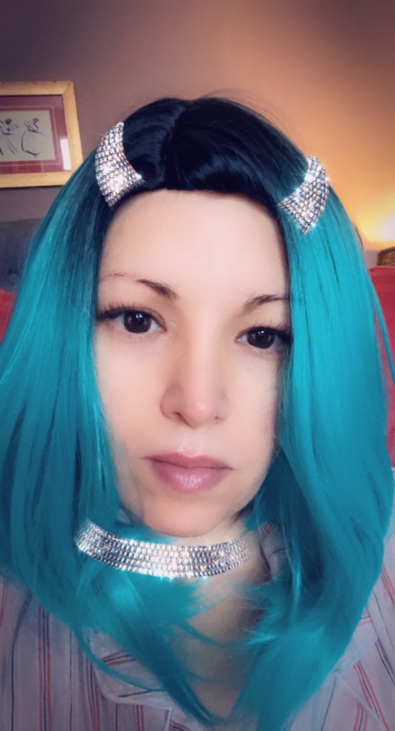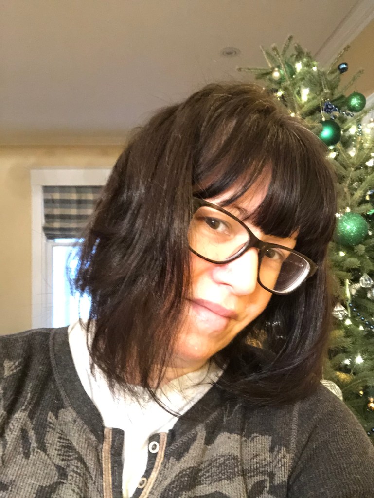 A reminder of my hair! Dark brown, bangs, straight, but air dried with a slight wave, and fell several inches past my shoulders.