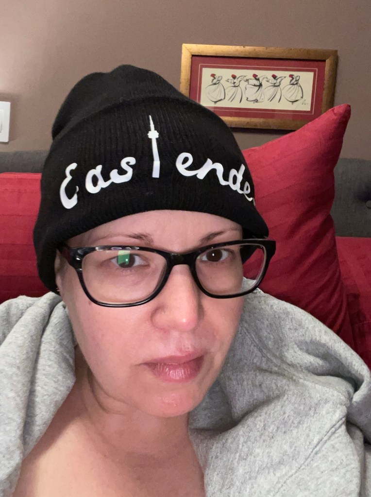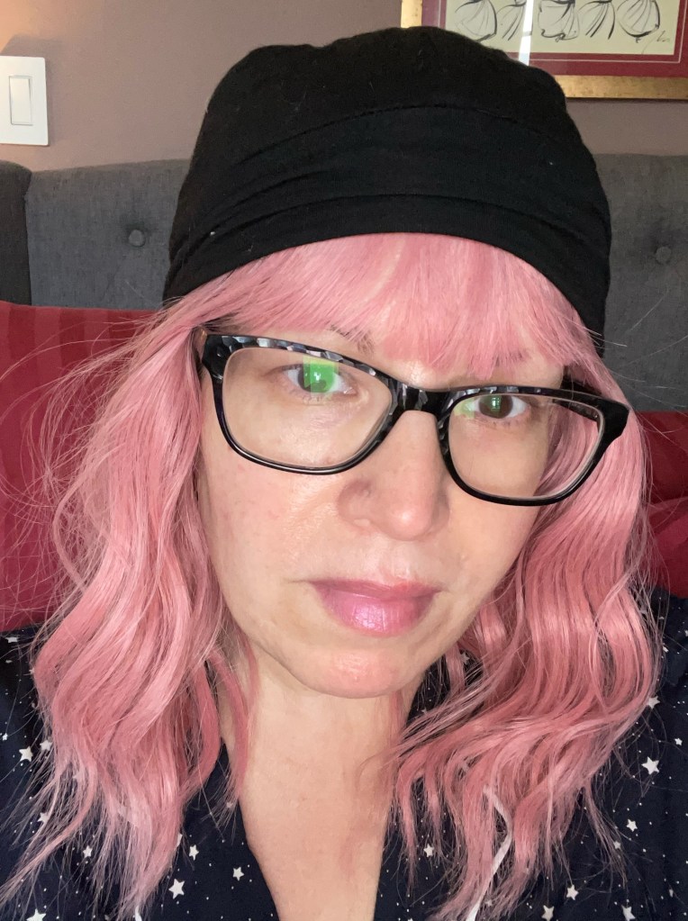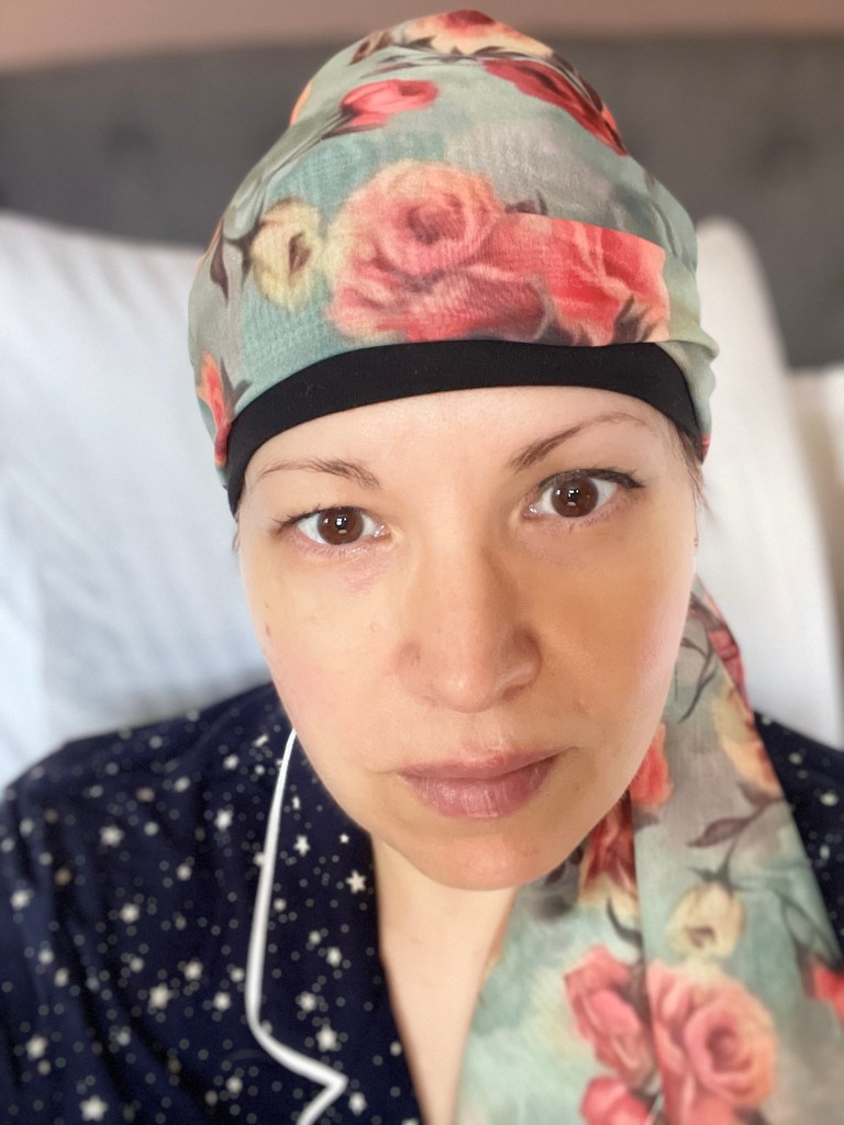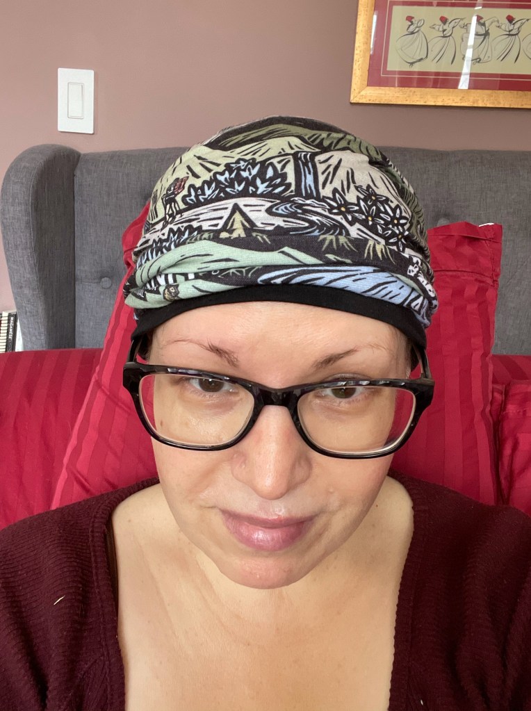 At the same time, as I was waiting for the hair loss to start, I was preparing by ordering head coverings, turbans, wigs, and digging out scarves I’d never really used. One of the great joys of travelling is being able to bring home beautiful things from other cities. I bring home a lot of scarves. And they usually sit in my closet. Well, they were just waiting for their time to shine! It’s true, it’s easiest to just throw on a close fitting fabric swim cap style, but I also love the turbans and wigs and buffs and toques. It’s actually a lot of fun. I mean, if you need to lose your hair to cancer, it’s your prerogative to do something to make you smile. If that means going bald as a baby – you do that. For me, it means bright colours, fun fabrics and usually, lipstick.