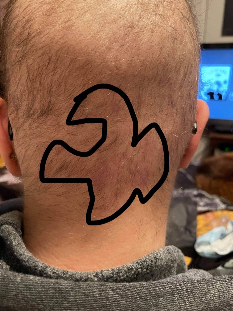 To the birthmark question – interestingly I have a large red mark on the back of my head – at times I see a swan, at other times I see a dragon. The girl with the dragon tattoo. As far as a misshapen head, very happy to say that I have a pretty nice shaped head, as far as heads go. If I do say so myself. My friend Michael commented that I have a great shaped scalp, and that it shows great genes. Thanks, Mom & Dad! 🙂